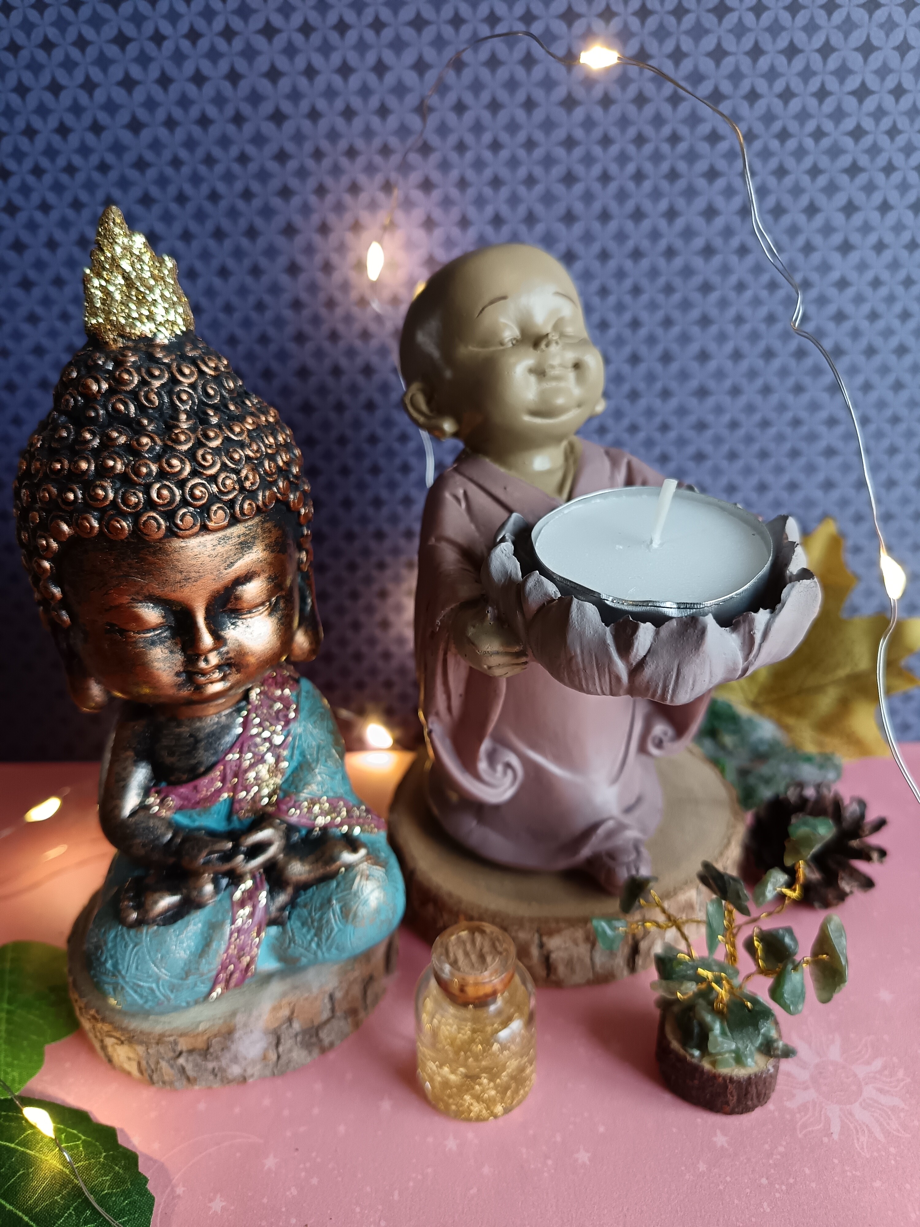 Statuette Bébé Bodhi + Bouddha Bougeoir en méditation, vous pouvez les placer où vous voulez selon votre souhait. Les Bouddhas sont considérés comme des porte-bonheurs et en font donc un cadeau idéal pour vos proches.