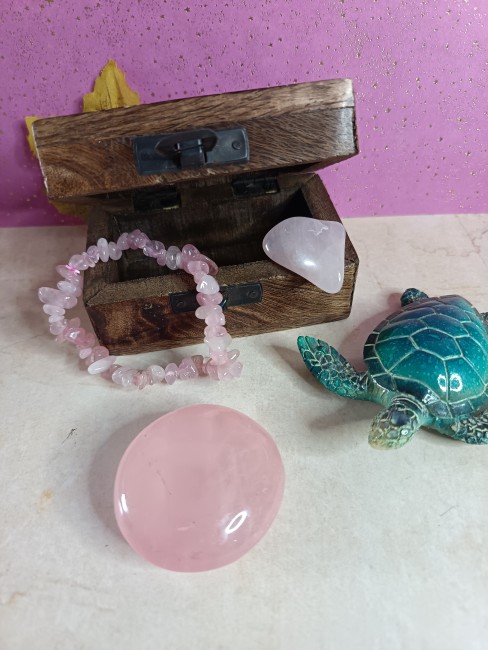 Le quartz rose apaise et permet de soigner les blessures affectives profondes, les peines de cœur et les traumatismes liés à l’enfance. Il développe la confiance en soi et l’assurance. Il aide à prendre conscience de l’amour que l’on se porte et favorise l’acceptation de soi et des autres.