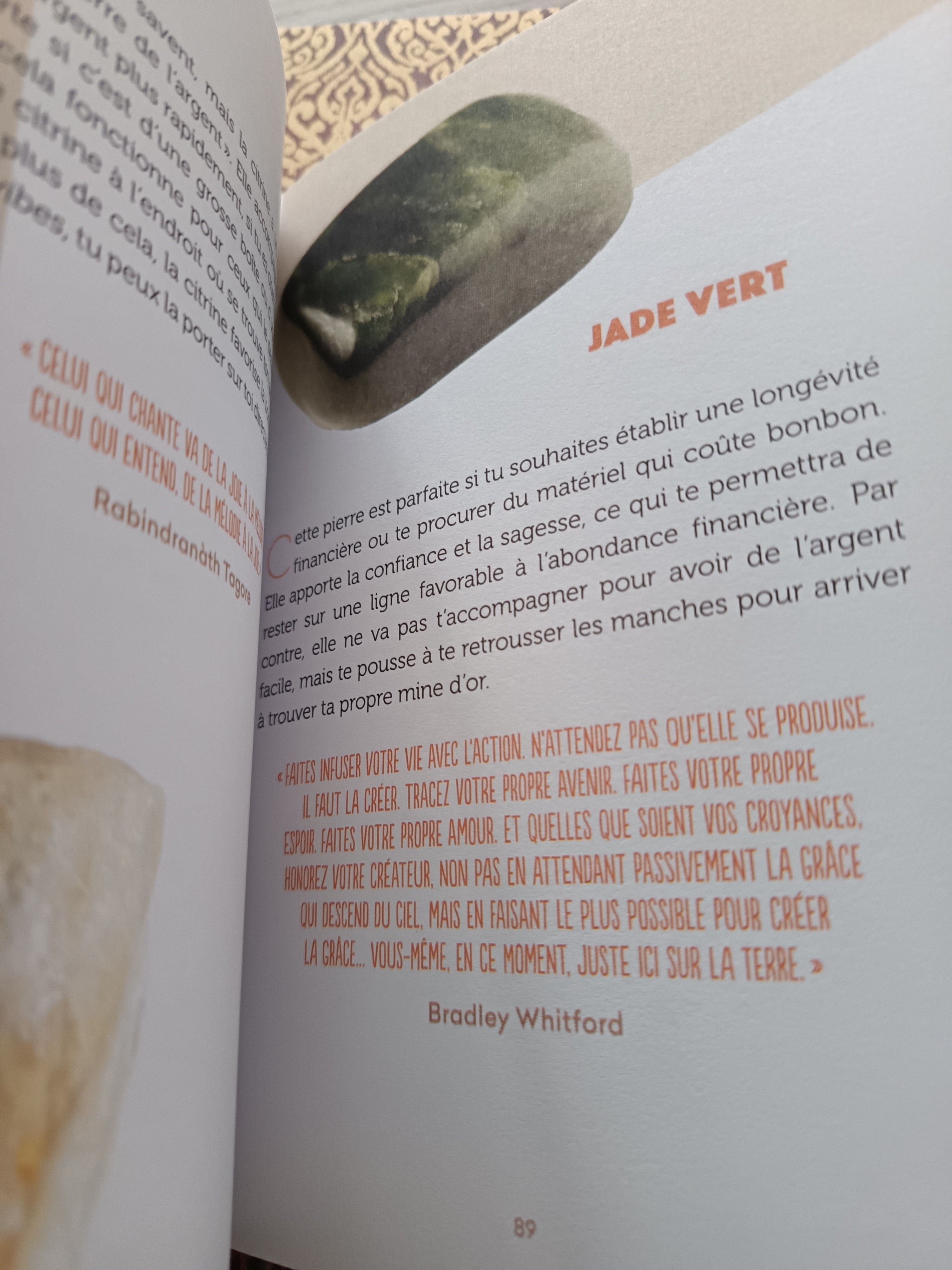 Dans ce manuel pratique, tu découvriras plus de 50 pierres ainsi que leurs propriétés et leurs bienfaits. Au fil des pages, tu recevras des conseils précieux et de nombreuses astuces pour les nettoyer, les purifier, les recharger. Tu trouveras aussi la pierre associée à chaque signe astrologique, celle qui peut te soutenir selon le mois en cours, et de nombreux rituels pour rééquilibrer tes chakras, libérer les énergies négatives ou simplement te ressourcer.